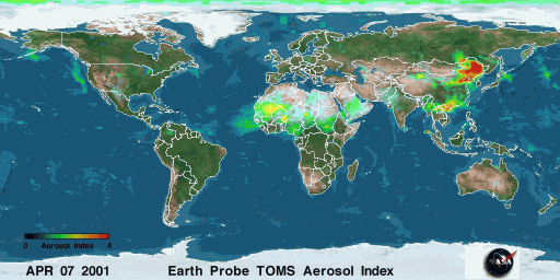 It is also a significant source of dust. The ongoing desertification, particularly in the southern regions, has increased the frequency and intensity of these dust storm events. The image to the left is of Beijing in Feb, 2021 during one of these storms. The NASA image above it, shows the world wide flow of dust coming from the Gobi and from the Sahara in 2001. Lots of DUST!